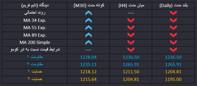 در طلا، قیمت در میان مدت در زیر حمایت شکسته شده 1236 دلاری رنج شده و در حال تشکیل الگوی مثلث متقارن می باشد. احتمال اول در میان مدت همچنان ادامه روند نزولی با پایان حرکت رنج و اصلاح زمانی قیمت است و با توجه به اینکه سطح حمایتی 1236 دلاری محدوده مهمی برای قیمت بوده است ، ایجاد پولبک و اصلاح زمانی از نظر تکنیکی قابل قبول است. در بلند مدت نیز شرایط روند نزولی حاکم است اما در نزدیکی قیمت محدوده حمایتی ماژور 1204 و 1195 دلاری قرار دارد که واکنش قیمت نسبت به این سطوح تعیین کننده است. در کوتاه مدت اما روند قیمت به صعودی تغییر یافته و با عبور قیمت از خط روند کوتاه مدت نزولی و میانگین های متحرک در تایم سی دقیقه احتمال صعود قیمت در کوتاه مدت و تا محدوده 135 و 1236 دلاری افزایش یافته است.