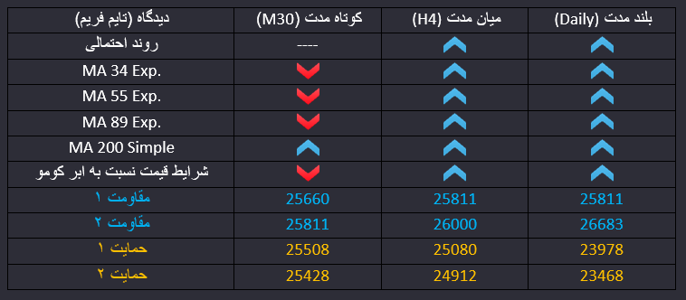 شاخص داوجونز، روز گذشته چین اعلام کرد که بر برخی از واردات آمریکایی به ارزش 16 میلیارد دلار تعرفه اعمال خواهد کرد. ضمن اینکه بازدهی اوراق قرضه آمریکا تا حدودی کاهش یافت که نشان از تمایل بازار به خرید اوراق در روزهای اخیر بوده است. در حال حاضر شاخص داوجونز پس از یک موج صعودی و عبور از مقاومت 25508، در شرایط اصلاح و پولبک در حرکت است و در کوتاه مدت احتمال نزول بیشتر قیمت وجود دارد اما در میان مدت و بلند مدت احتمال اول همچنان ادامه روند صعودی قیمت با پایان یافتن اصلاح و پولبک خواهد بود. قیمت در میان مدت به PRZ حاصل ازحمایت 25508 و میانگین میان مدت 34 در تایم فریم چهارساعته رسیده و واکنش قیمت نسبت به این محدوده تعیین کننده خواهد بود.
