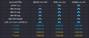 قیمت سطح مقاومتی 1300 دلاری را شکسته و از محدوده رنج زیر 1300 دلار با اعتبار خارج شده است و انتظار صعود قیمت در میان مدت افزایش یافته است. سطح مقاومت 1310 دلاری برای 8 ماه اخیر بالاترین قیمت طلا بوده است و حالا واکنش قیمت نسبت به این مقاومت 8 ماهه با اهمیت خواهد بود. احتمال اول در میان مدت ادامه روند صعودی است.