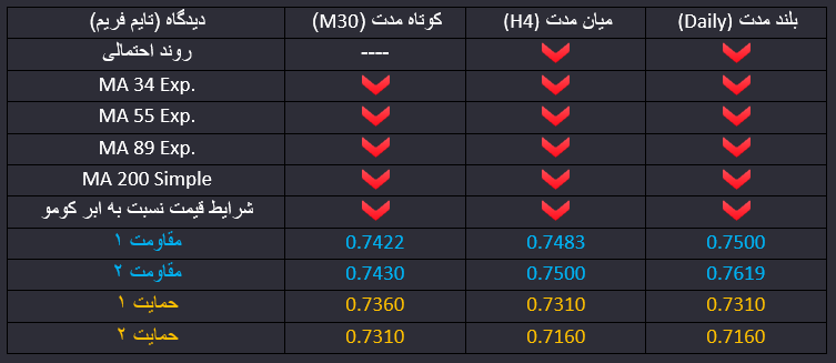 قیمت در بلند مدت و در یک روند نزولی و با پایان اصلاح به کف تاریخی خود در محدوده 0.7310 نزدیک شده است و در حالی که احتمال اول ادامه روند نزولی قیمت در بلند مدت است، اما واکنش قیمت نسبت به این کف تاریخی که کمترین قیمت در بیش از یکسال و شش ماه اخیر بوده است، تعیین کننده خواهد بود. در میان مدت قیمت در محدوده میانه چنگال اندروز نزولی قرار دارد و سطوح حمایتی میانگین های میان مدت و ابر کومو در تایم فریم چهارساعته را شکسته و احتمال اول نزول بیشتر قیمت در میان مدت است اما همانند روند بلند مدت حمایت ماژور 0.7310 را در برابر خود می بیند که به تازگی نسبت به آن واکنش برگشتی داشته است. در کوتاه مدت حمایت ماژور از این هم نزدیک تر است و در محدوده قیمتی 0.7360 قرار دارد . با توجه به شارپی بودن نزول قیمت در کوتاه مدت احتمال بالایی در واکنش اصلاحی قیمتی و زمانی کوتاه مدت در این محدوده یعنی قیمت 0.7360 وجود دارد.