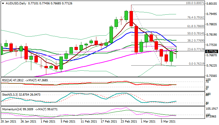 Fresh recovery attempts after repeated failures to clearly break into rising daily cloud (the action was contained by Fibo 38.2% of 0.6991/0.8000), were so far unsuccessful as the pair lack positive momentum for stronger advance, despite the action remains underpinned by thick daily cloud.