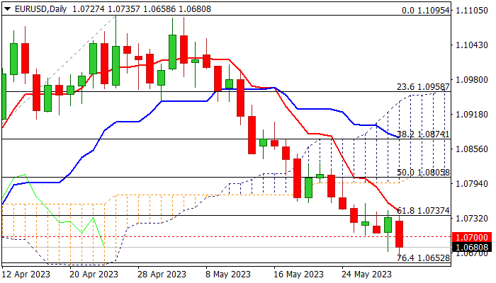 The Euro came under renewed pressure and fell to new nine-week low on Wednesday, bringing larger bears back to play after brief consolidation above 1.07 support.