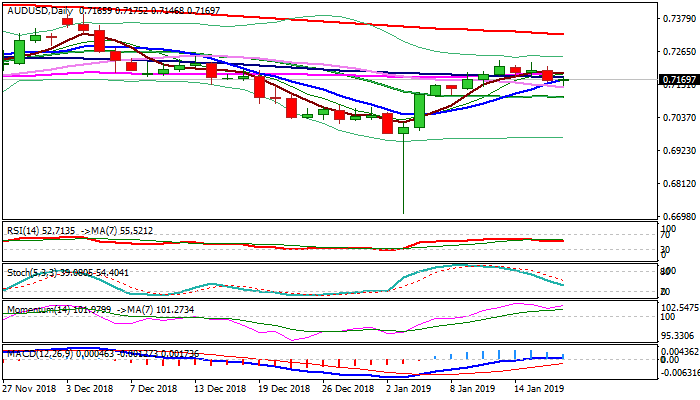 The Australian dollar holds in tight range on Thursday, following bearish close below near-term congestion floor / 100SMA support (0.7176) on Wednesday, as rising thick 4-hr cloud (0.6970/0.7178) limits dips and strongly underpins.