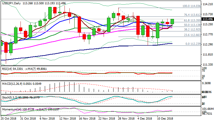 The pair maintains positive tone and pushes again above pivotal Fibo barrier at 113.35 (61.8% of 114.03/112.23) after repeated failure to eventually close above it and signal continuation of recovery from 112.23 double-bottom.