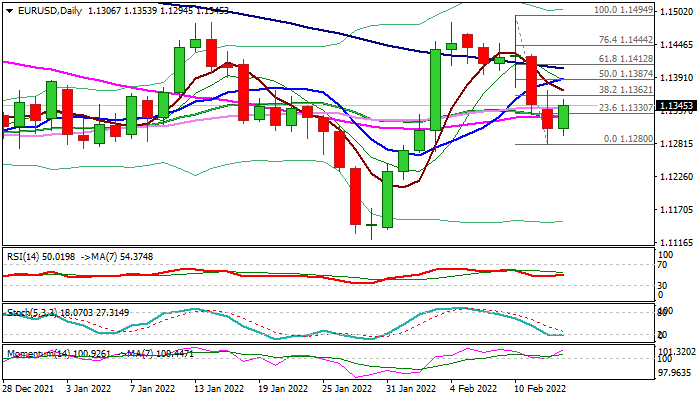 Fresh bulls pressure key double-Fibo barriers at 1.1350 zone (broken 38.2% of 1.1121/1.1494 upleg and 38.2% of 1.1494/1.1280 pullback), with sustained break here needed to generate bullish signal and open way for further advance.
