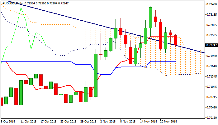 Thursday’s close in red and Friday’s extension lower which returned to daily cloud (cloud top lays at 0.7247) weakened near-term structure.