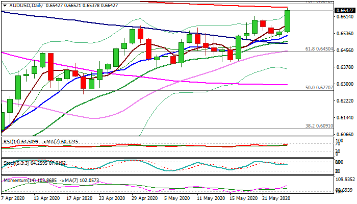 Bulls look for close above 200DMA and 0.6672/84 (Fibo 76.4% of 0.7032/0.5509 / 9 Mar high) to spark fresh acceleration higher and expose next key barrier at 0.6848 (weekly cloud base).