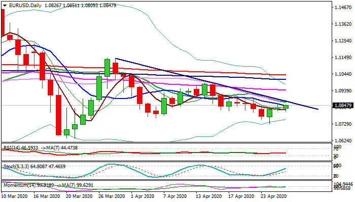 Fresh advance which goes against larger downtrend and is boosted by renewed risk sentiment over relaxing coronavirus restrictions, is testing falling 10DMA (1.0842) and eyes more significant barriers at 1.0867/71 (converged falling 20/30DMA’s / bear-trendline off 1.1147 high) and 1.0887 (Fibo 38.2% of 1.1147/1.0727).