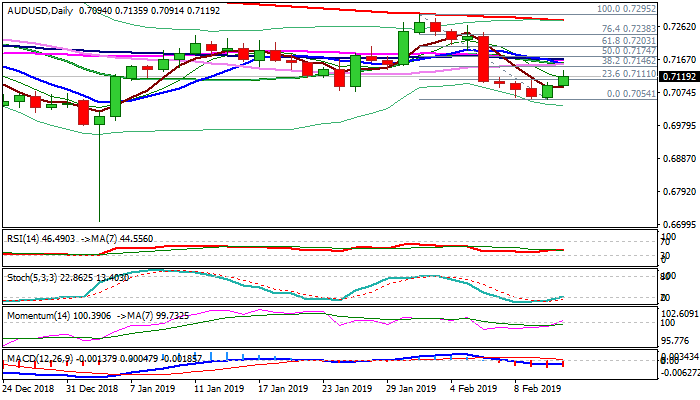 The Aussie dollar extends recovery from 0.7054 lows, underpinned by surge of kiwi dollar on less dovish RBNZ earlier today and fresh risk appetite on renewed optimism over US/China trade talks.