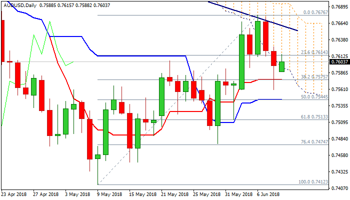 Another close below cloud will be bearish signal and could risk retest of 20SMA (0.7567), break of which is needed to confirm reversal, as 20SMA is reinforced by Fibo 38.2% of 0.7412/0.7676 rally (0.7575).