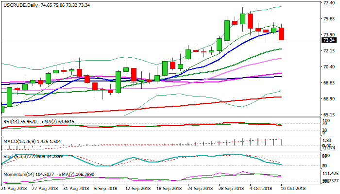 South-heading momentum indicators on daily chart support further weakness, as fresh bears approach key near-term support at $73.05 (Fibo 38.2% of $66.85/$76.88 / 08 Oct low), break of which would provide fresh bearish signal for further extension lower.