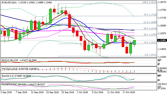Fresh advance extends Friday’s rally and cracked daily cloud base (1.1545) and could attack next pivotal barriers at 1.1560/70 (20SMA / daily cloud top).