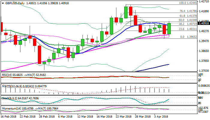 Strong bounce from 30SMA (1.3979) which repeatedly contained downside attempts, along with daily cloud top, is on track to form bullish outside day (which sees minimum requirement on close above 10SMA) and generate strong bullish signal for extension of recovery leg from 1.3965 (05 Apr low).
