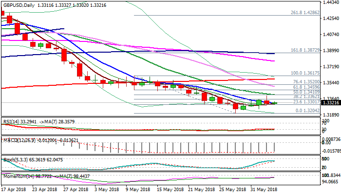 Cable is moving around falling 10SMA (1.3315) and holding within narrow range on Tuesday, after Monday’s action stalled on approach to key barrier at 1.3410 (falling 20SMA / 50% retracement of 1.3617/1.3204).