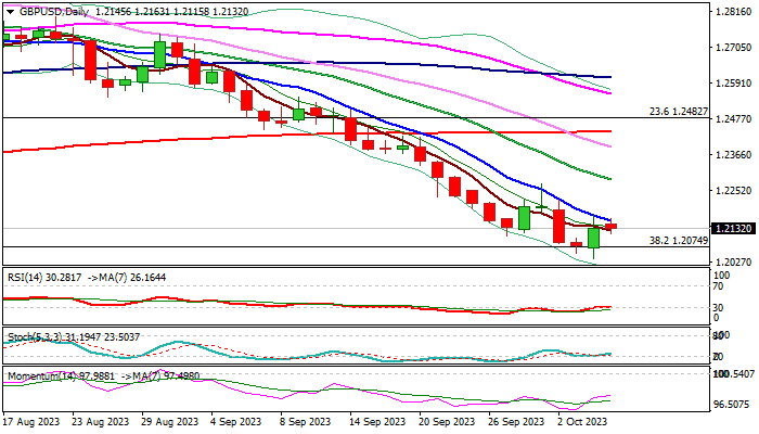 Larger bears faced a double rejection at pivotal Fibo support (38.2% of 1.0348/1.3141) at 1.2074, but mild correction (capped by 10DMA) keeps the downside vulnerable, with eventual break here to expose psychological 1.20 support and daily cloud top at 1.1988.
