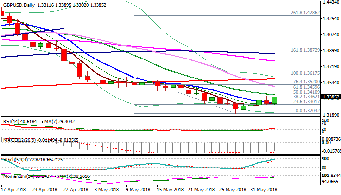 Near-term picture improved on fresh rally, turning near-term bias higher, however, close above Monday’s spike high at 1.3398 is seen as minimum requirement to keep bullish bias for test of key barrier at 1.3410 (50% of 1.3617/1.3204 / falling 20SMA).