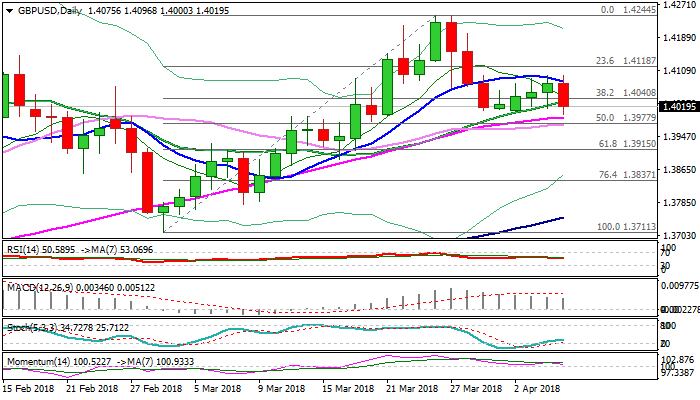 Cable came under increased pressure after UK Services PMI came in much weaker than expected figure in March (51.7 vs 53.9 f/c and 54.5 in Feb) and dipped to 1.40 support on subsequent bearish acceleration.