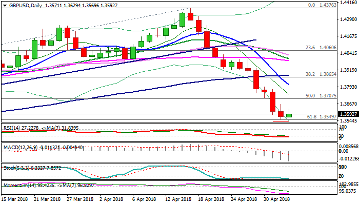 Steep descend from 1.4376 (16 Apr peak) found footstep at 1.3550 (Fibo 61.8% of 1.3038/1.4376 ascend, reinforced by rising 200SMA at 1.3533), above which strong bears may take a breather on oversold daily studies and profit-taking.