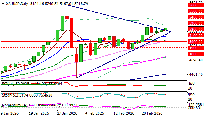 Gold price jumped in early US session on Friday after holding within a narrow range during Asian / European trading, as bull regained traction after three-day consolidation under new recovery high at $5249 (Feb 24).