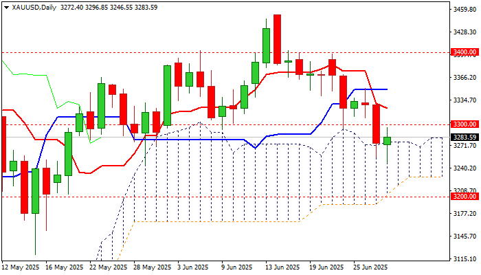 Bullish scenario – initial positive signal on clear break of $3300 zone, which will need verification on lift above $3325 (Fibo 38.2% of $3452/$3246 descend) and open way for possible stronger recovery.