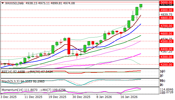 Today’s shallow dips stayed above initial support at $4900, despite strong negative technical signals and expectations for more significant profit taking at the end of the week.