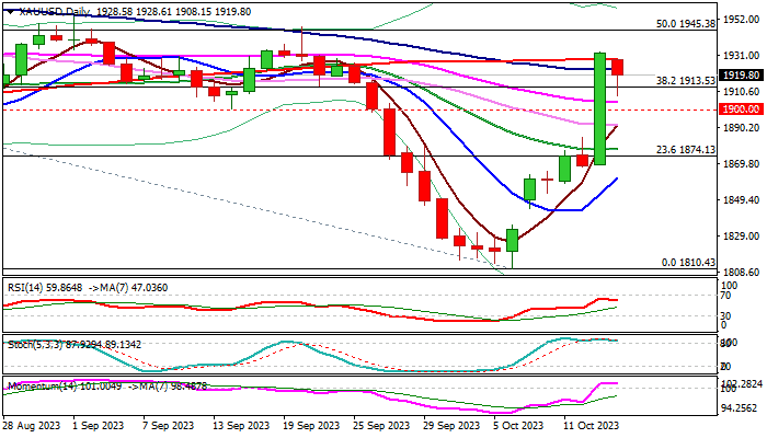 Weekly close well above pivotal Fibo barrier at $1913 (38.2% retracement of $2080/$1810 downtrend) and completion of reversal pattern on weekly chart contributed to bullish signals, adding to prospects for further advance).