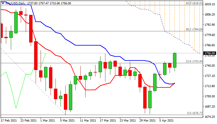 Fresh bullish acceleration is heading towards strong barrier at $1773 (base of falling and thickening daily cloud), with penetration into cloud to generate fresh bullish signal for test of next key level at $1784 (Fibo 38.2% of $1959/$1676 descend).