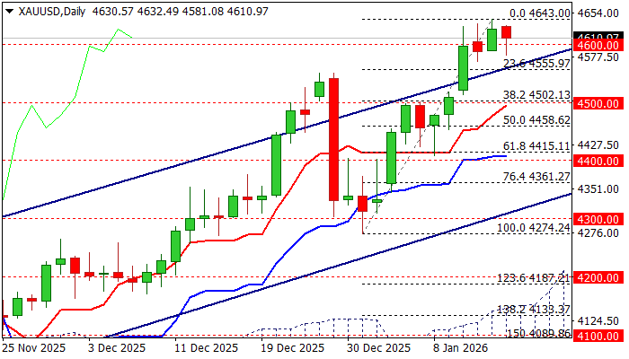 Today’s dip was so far limited, with price holding above $4600 after a brief dip to $4581, although overbought daily studies (also RSI bearish divergence), keep the downside vulnerable.