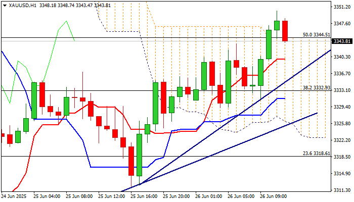 Fresh gains on Thursday cracked important barrier at $3345 (100HMA / 50% retracement of $3393/$3295 bear-leg / hourly cloud top) that unmasks targets at $3356 (Fibo 61.8% / 20DMA) and $3370 (Fibo 76.4% / 10DMA), guarding upper breakpoint at $3400.
