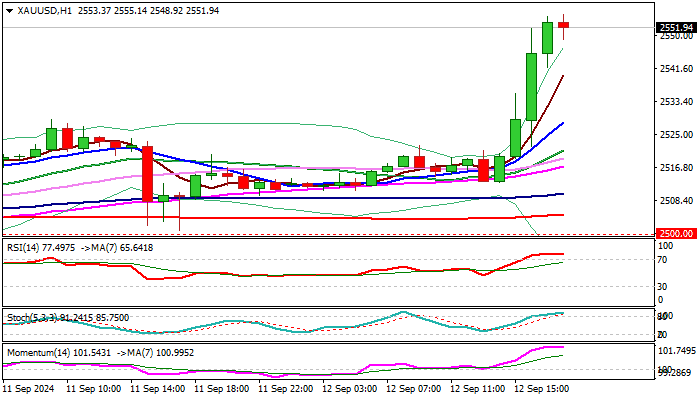 The yellow metal price hit new record highs and met the first target at $2554 (Fibo 138.2% projection of the upleg from $2471), with further advance to focus $2561 (161.8%), $2591 (200%) and 2600 (psychological and 2024 peak, according to many analysts.