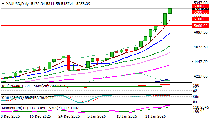 Gold cracked $5300 barrier and hit new record high ($5311) in early Wednesday, remaining in steep and uninterrupted rally that has registered the fastest moves from one to another round-figure level (less than 25 hours), after the price broke psychological $5000 barrier.