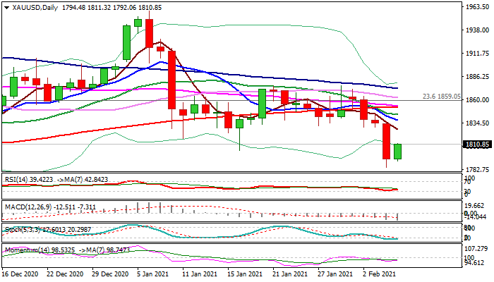 Spot gold is consolidating above new two-month low ($1785) posted on Thursday after 2.2% daily drop (the biggest one-day loss since Jan 8) which broke and closed below psychological $1800 level.