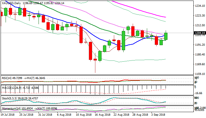 Fresh bullish acceleration broke above psychological $1200 barrier, reinforced by 10SMA and probed above $1204 pivot (Fibo 61.8% of $1214/$1189 bear-leg).