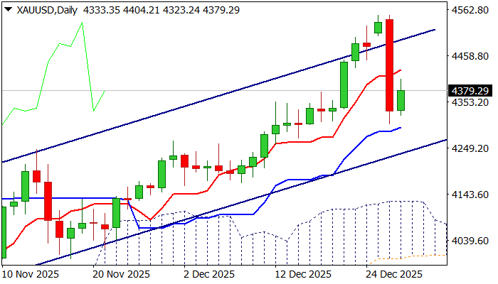 Monday’s fall found firm ground just above $4300 (round-figure /daily Kijun-sen), with subsequent bounce cracking $4400 (psychological /Fibo 38.2% of Monday’s $4550/$4302 pullback), though firm break here is needed to generate fresh bullish signal and reduce still existing downside risk.