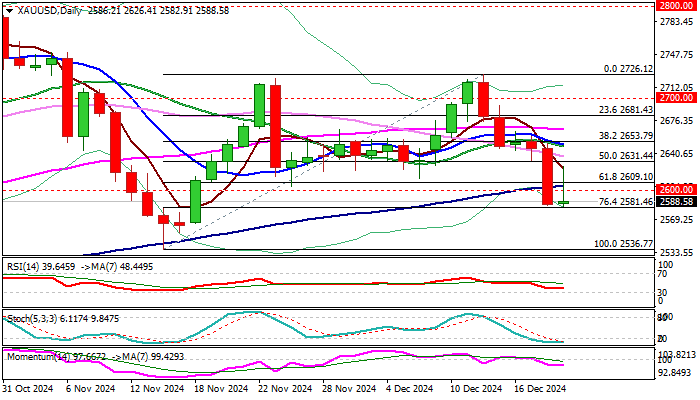However, temporary base that has formed at $2581 (lows of Wed/Thu / Fibo 76.4% of $2536/$2726) marks solid support which may hold for some time.