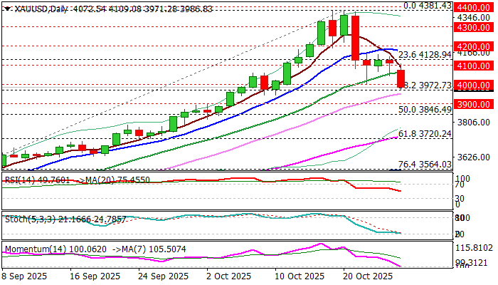 Fresh bears also cracked important Fibo support at $3972 (38.2% of $3311/$4381) with sustained break of these supports to validate strong bearish signal and open way for potential deeper drop towards $3900 (round figure) and $3846 (50% retracement) in extension.