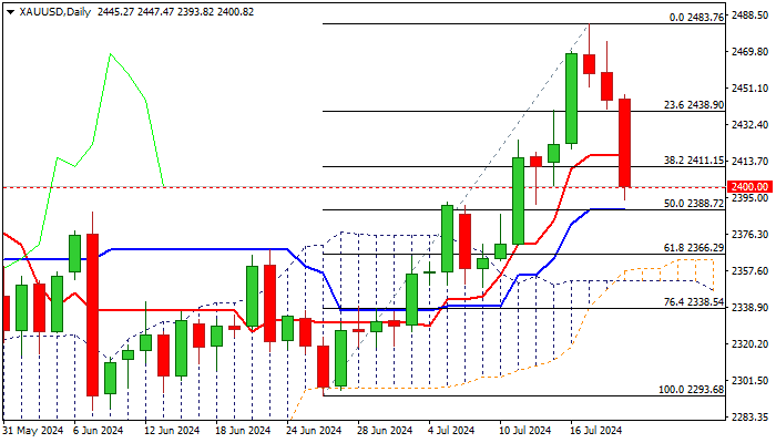 Round-figure support ($2400) was dented today, but failure to register weekly close below here, would keep in play scenario of a healthy correction preceding fresh push higher.