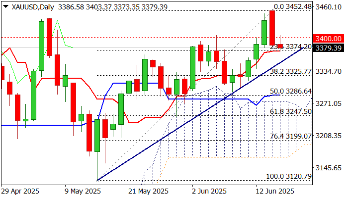 Surprise drop despite escalation of conflict between Israel and Iran still looks as correction and positioning for fresh push higher, as initial support at $3374 (Fibo 23.6% of $3120/$3452 / daily Tenkan-sen) contained dip.