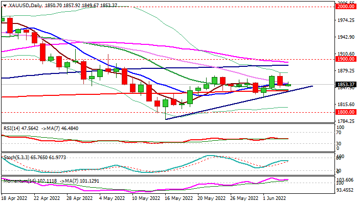 Strong supports lay at $1840 zone and $1828 (June 1 low / the floor of near-term range) break of which would weaken the structure and risk deeper drop on completion of double-top pattern.