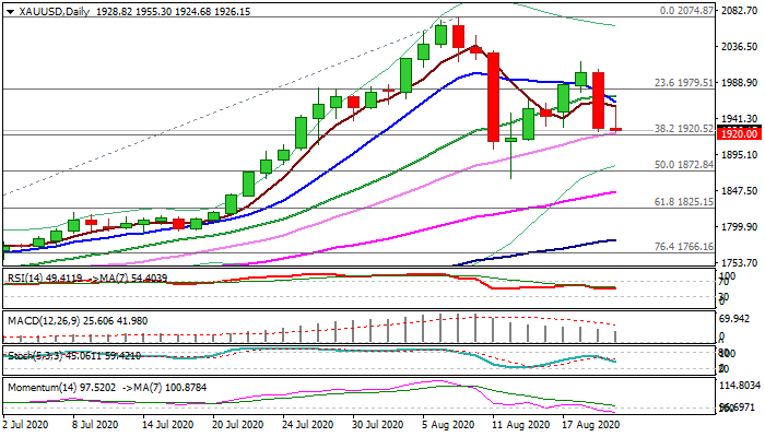 Spot gold remains under pressure on Thursday following 3.7% fall previous day, as subsequent recovery attempts from one-week low at $1924 stalled and metal’s price fell back near Wed-Thu lows ($1924).