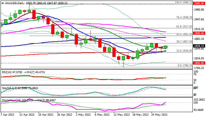 Spot gold regained traction and rose on Friday, following a shallow dip in past two days. Near-term action has established above 200DMA that adds to bullish near-term bias, however it is still ranging between 200DMA ($1839) and $1867 (Fibo 38.2% of $1998/$1786).