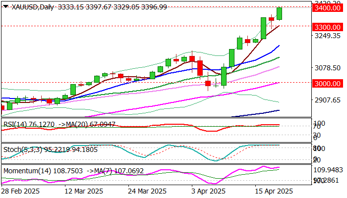 Fresh gains came just ticks ahead of $3400 level, where headwinds are expected as daily studies are strongly overbought, while hourly indicators form initial reversal signal (momentum and stochastic bearish divergence).