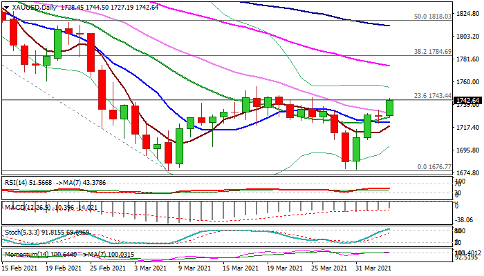 Bulls cracked initial Fibo barrier at $1723 (23.6% of $1959/$1676) and eye pivotal barrier at $1755 (Mar 18 high) break of which is required to generate stronger reversal signal on completion of a double-bottom on daily chart.