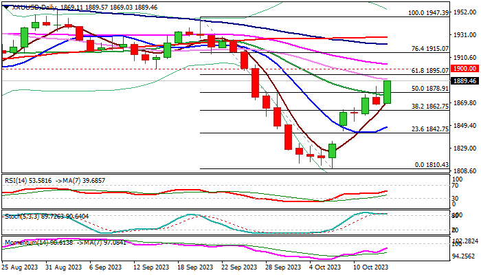 Fresh extension of recovery leg from $1810 (Oct 6 low) retraced over 50% of $1947/$1810 bear-leg), exposing key barriers at $1895/$1900 (Fibo 61.8% / psychological) and increasing the prospects for further gains on break.