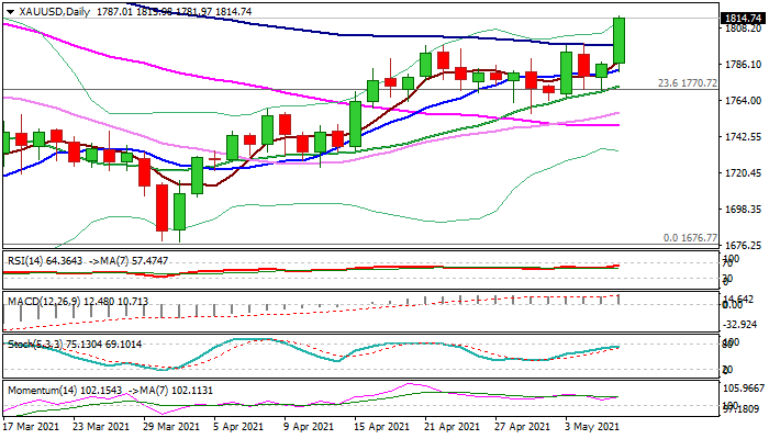 Fresh advance broke through $1800 zone which capped the action in past two weeks and rallied deeper into thick weekly cloud (spanned between $1760 and $1891).