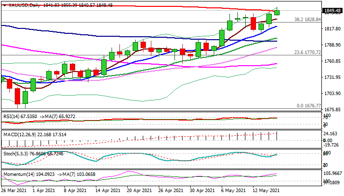 Fresh advance broke above previous high at $1845 (May 10) and probe through 200DMA ($1847), exposing next strong barriers at $1871/75 (weekly cloud top / 50% retracement of $2074/$1676 descend) violation of which would boost bullish stance and open way for $1900+ gains.