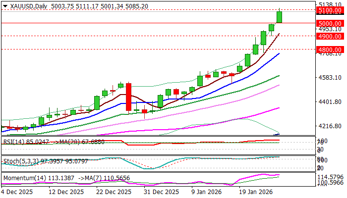 Gold took out $5000 barrier in one single step on Monday, in a widely expected post-weekend action, but made a small surprise to traders by extension to $5100, which happened in just few hours of early Monday’s trading.