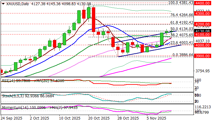 Very limited profit taking keeps the price afloat above $4100 (reverted to solid support) while upticks were capped at $4145 and so far unable to register close above cracked important Fibo resistance at $4134 (50% retracement of $4381/$3886 / daily Kijun-sen / bull-channel upper boundary), clear break of which to spark fresh acceleration higher.