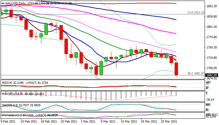 Bears cracked pivotal Fibo support at $1681 (38.2% of $1046/$2074) and pressure another key level at $1676 (Mar 8 low, the lowest since early June 2020).