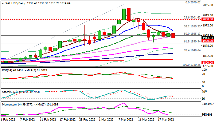Fresh bears may attack again key $1900 zone (psychological / Mar 16 low at $1894 / Fibo 61.8% of $1780/$2070 rally at $1890), with clear break here to further weaken near-term structure and signal extension of pullback a multi-month high at $2070.